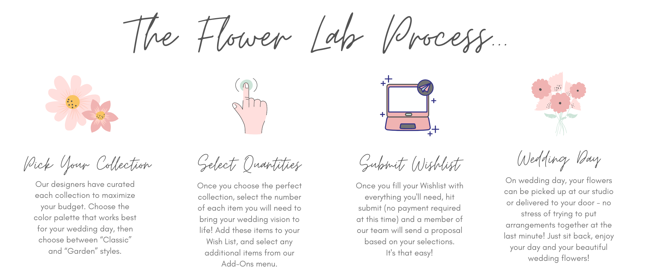 We believe all St. Louis couples deserve beautiful, professionally designed, real flowers for their wedding, but we also know that custom designs don’t work with all wedding budgets and needs. The team at Belli Fiori Floral & Event Design created The Flower Lab to allow couples to select curated floral packages to best fit their wedding style and budget. Don’t stress yourself or your loved ones out over how to DIY your wedding flowers; let our design team do the work for you! Our Flower Packages are perfect for micro-weddings, elopements, or budget-conscious couples, and our process couldn’t be easier…